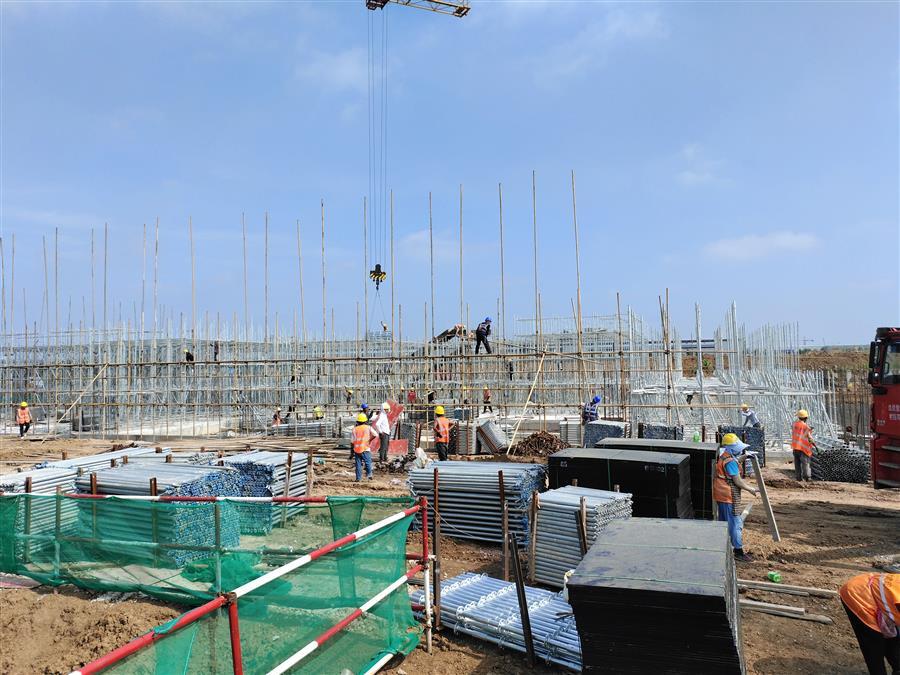 “日均投入施工技術(shù)人員500余人、各類機(jī)械設(shè)備45臺搶抓施工節(jié)點?!表椖控?fù)責(zé)人禤旭云說,自6月開工以來,針對項目工期緊、任務(wù)重的情況,項目部按照“開工即攻堅、起步即沖刺”的要求,全面推進(jìn)項目建設(shè)。目前,中試車間基礎(chǔ)回填、褥墊層鋪筑、墊層澆筑、剛性地面鋼筋綁扎完成;1#生產(chǎn)車間53~56軸獨基開挖基礎(chǔ)承臺鋼筋綁扎、模板安裝、砼澆筑完成,48~52軸基礎(chǔ)開挖、墊層澆筑完成;2#生產(chǎn)車間18~25軸基礎(chǔ)承臺鋼筋綁扎、模板安裝、砼澆筑完成;倉庫基礎(chǔ)梁全部完成。