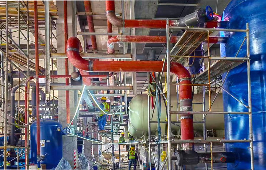 7月以來,項目部精心組織,細(xì)化項目施工任務(wù),抓住施工“黃金期”加快推進(jìn)項目建設(shè)。項目全體人員頂著高溫酷暑,堅守崗位,高標(biāo)準(zhǔn)、嚴(yán)要求,全力保障工程質(zhì)量和進(jìn)度,推動項目建設(shè)順利有序進(jìn)行。目前,項目1#玉米加工車間屋面蒸發(fā)冷設(shè)備安裝完成,管道安裝完成90%;壓縮機(jī)、桶泵機(jī)組設(shè)備完成安裝,管道安裝完成50%、速凍機(jī)組設(shè)備安裝完成40%;3#配送中心機(jī)房屋面蒸發(fā)冷安裝完成及管道安裝完成80%;4#冷鏈配送中心室內(nèi)設(shè)備及管道安裝完成90%。