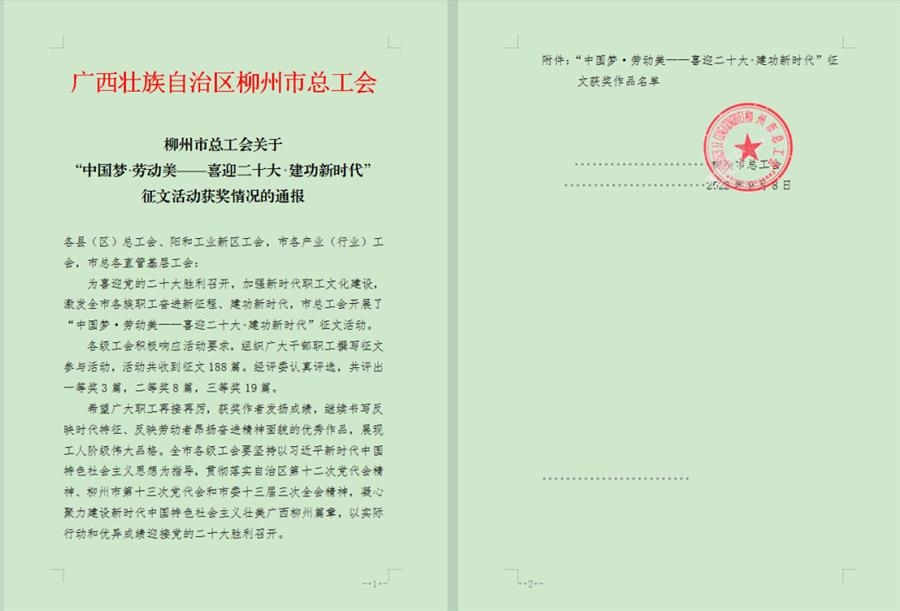 近日,柳州市總工會(huì)發(fā)布關(guān)于“中國(guó)夢(mèng)?勞動(dòng)美——喜迎二十大 建功新時(shí)代”征文活動(dòng)獲獎(jiǎng)情況的通報(bào),冶建公司職工作品榮獲三等獎(jiǎng)。