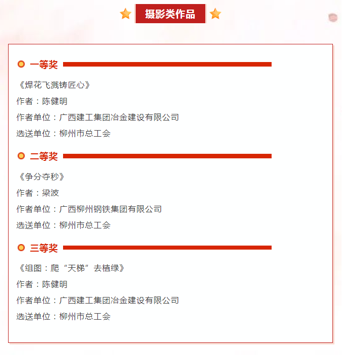 據(jù)了解,自活動啟動以來,全市各級工會和廣大職工朋友積極響應(yīng),共報(bào)送各類作品124件,柳州市共有14件優(yōu)秀作品獲獎,其中公司有2件作品獲獎,分別是《焊花飛濺鑄匠心》和《組圖:爬“天梯”去植綠》。